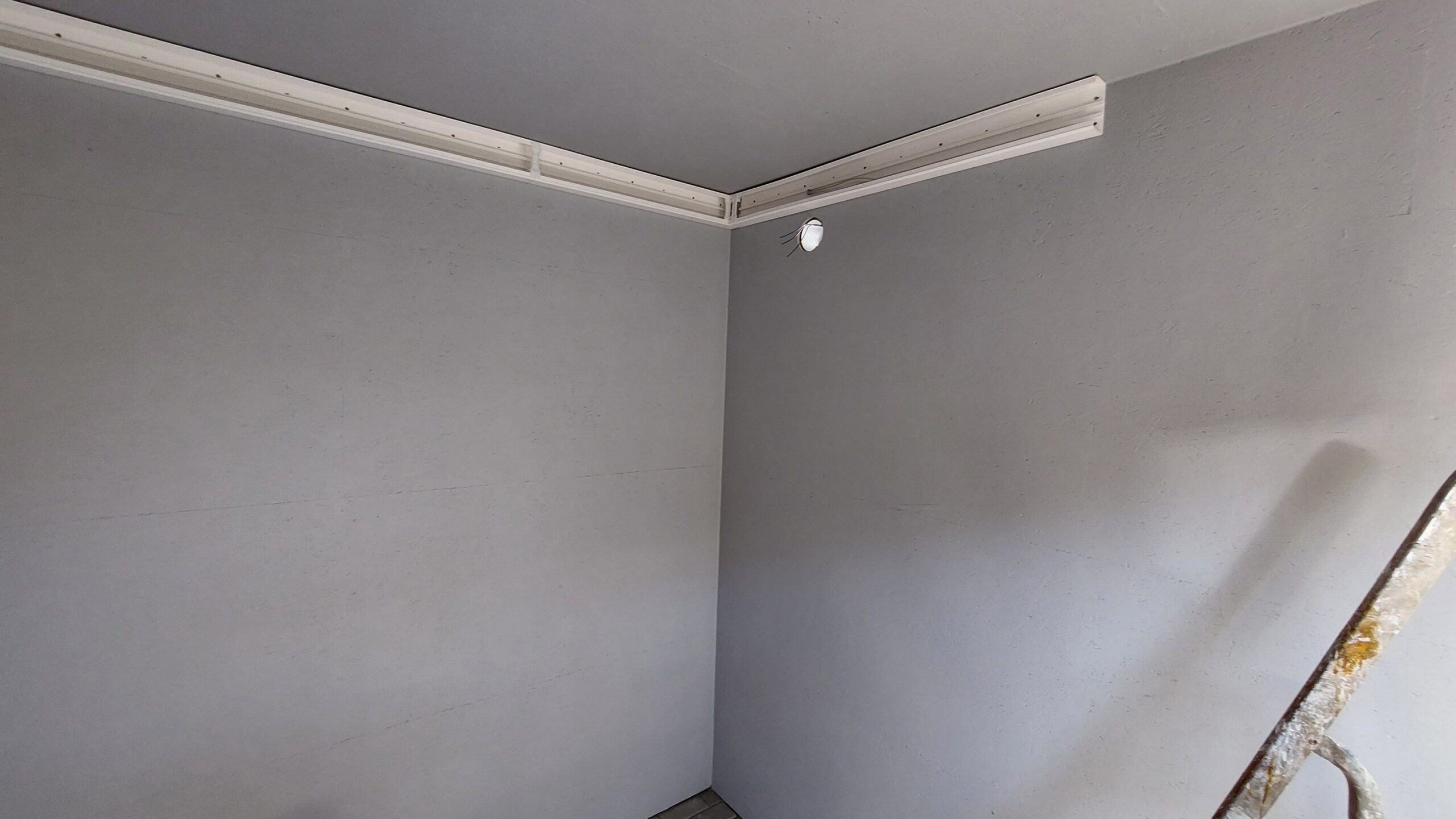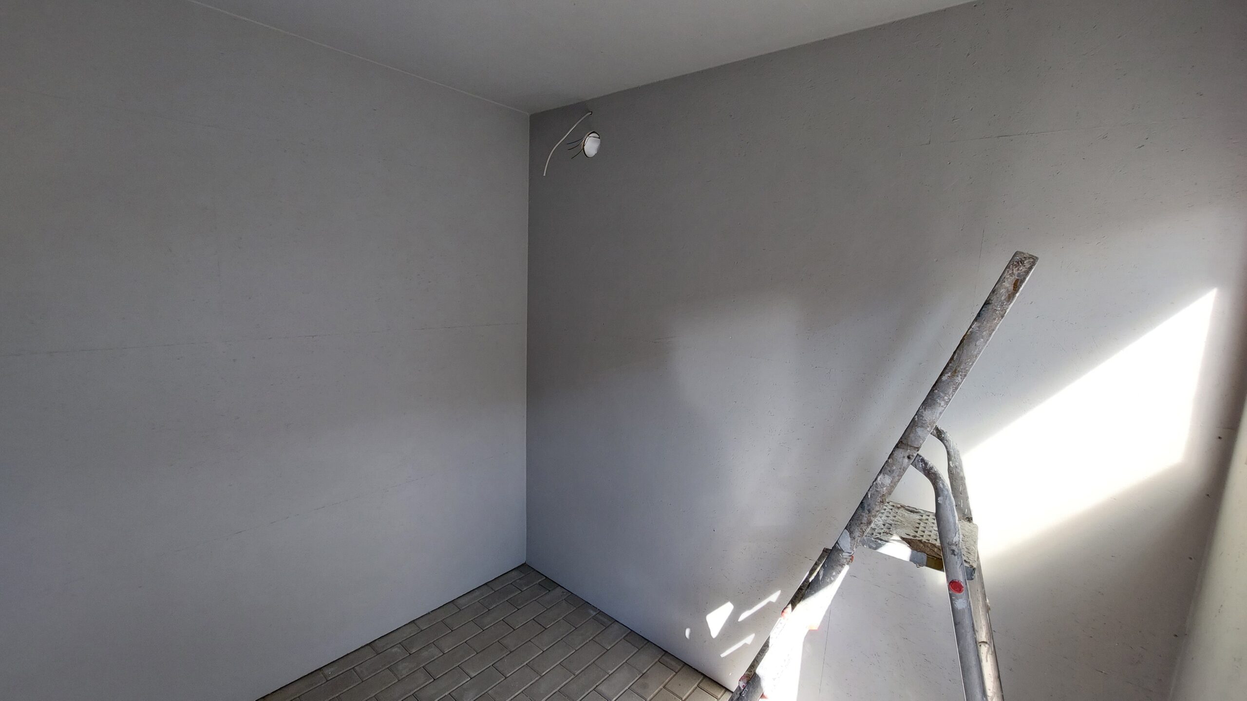 Ich verwende hierfür Fassadenfarbe, da sich Schimmelpilze auch bei längerer Feuchtigkeit im Raum nicht so schnell bilden. Ich streiche die Decke und die Wände insgesamt zweimal, um eine gleichmäßige Deckung zu erzielen.
