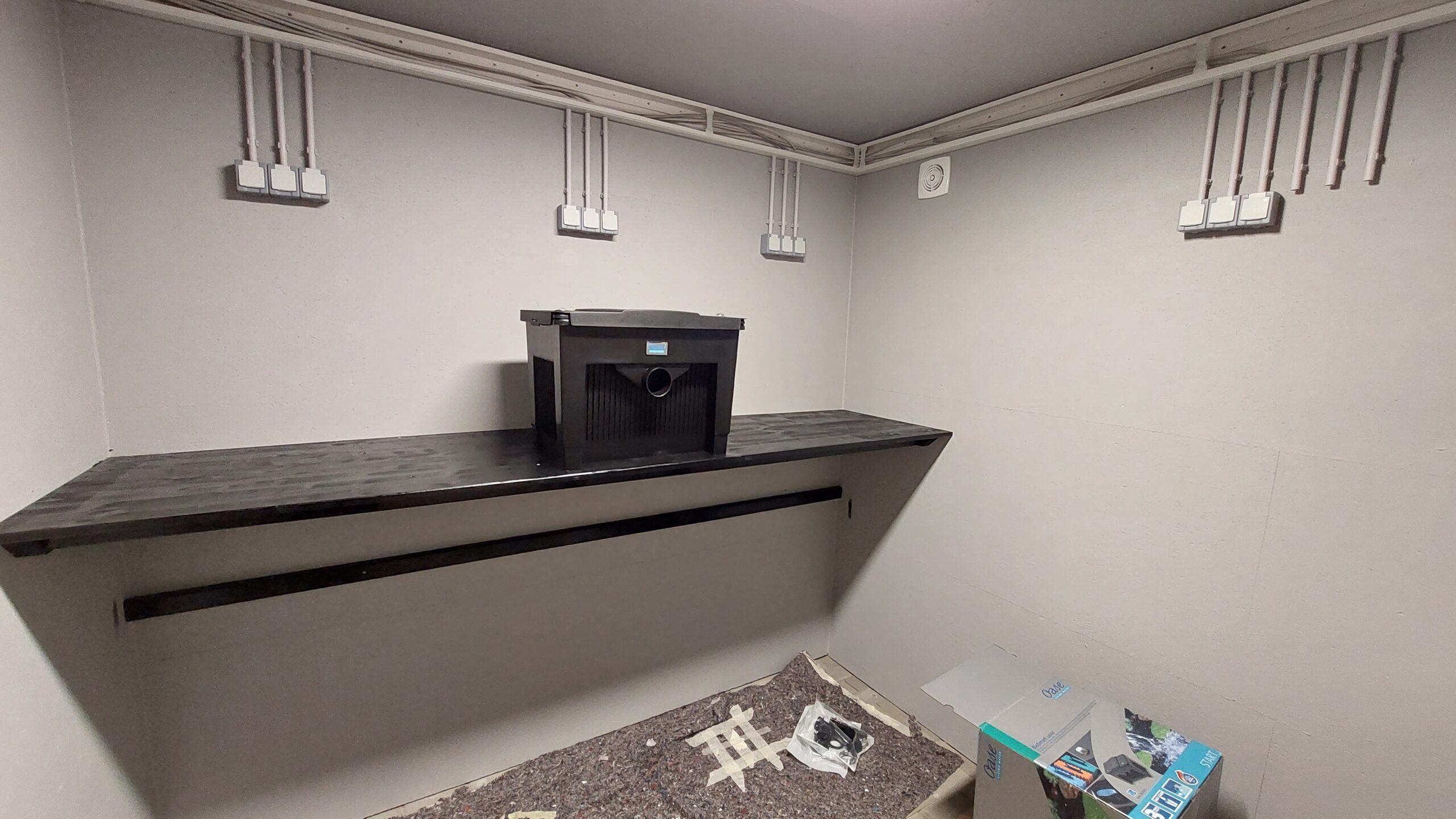 Nachdem fast alle Steckdosen verdrahtet sind – es fehlen noch ein paar, da mir die Leitung zur Neige ging – beschäftigen wir uns mit der Standfläche, auf der später die Filter stehen. Ich schraube die Kreuzrahmen an drei Seiten an die Wand. Oben auf den Kreuzrahmen befestige ich die Leimholzplatten und versiegle alles mit schwarzem Acryllack.
