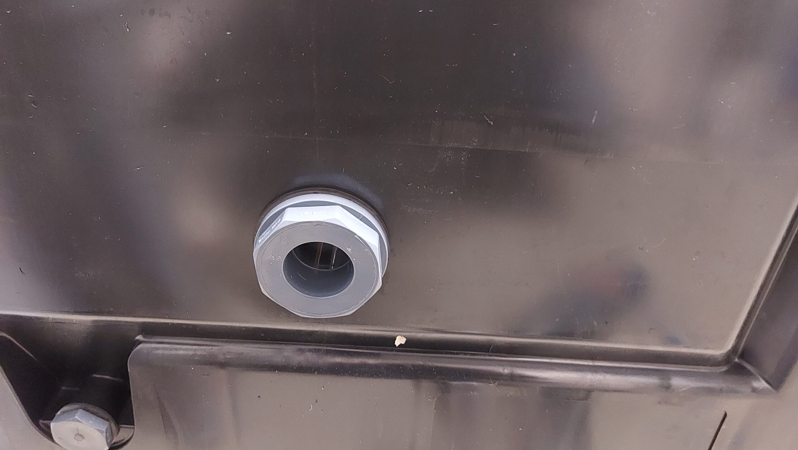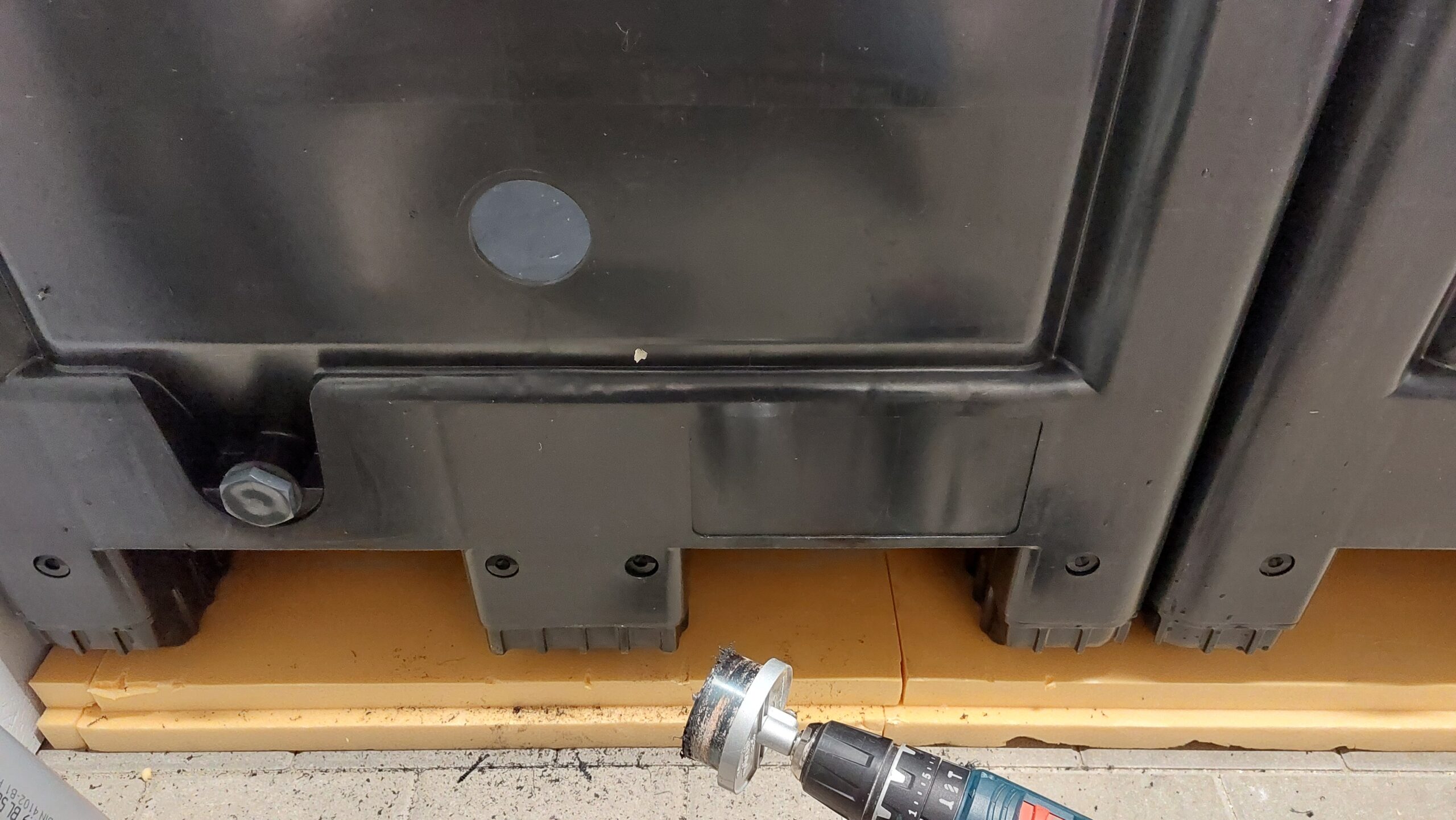 Der Ablauf – siehe oben im Bild (unten links, die kleine Schraube) – wurde bereits vom Lieferanten vorbereitet. Ich werde dort aber zunächst nichts weiter anschließen. Den Ablauf der Becken möchte ich über eine Tankdurchführung mit zweimal 40‑mm‑Klebemuffen realisieren. Aus Sicherheitsgründen installiere ich den Ablauf nicht direkt am Boden, denn sollte eine Verrohrung brechen oder undicht werden, würde das gesamte Wasser aus dem Becken auslaufen und die Goldfische lägen auf dem Trockenen. Ich bohre etwa 15 cm über dem Boden mittig ein Loch mit der Lochsäge. Die Tankdurchführung hat einen Durchmesser von knapp 48 mm, weshalb ich eine Lochsäge mit 50 mm wähle – und hoffe, dass alles passt.