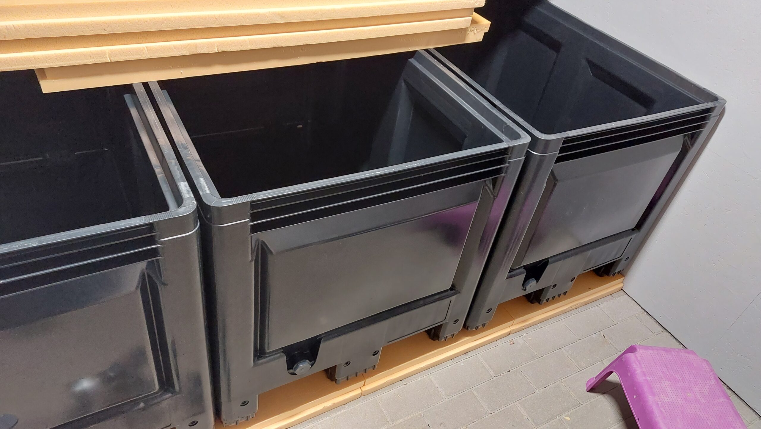 Wie am Anfang der Serie erwähnt, wurde der Boden des Gartenhauses nicht gedämmt. Um Strahlungskälte zu verhindern und damit die Goldfische nicht kalte „Füße“ bekommen, habe ich mich dazu entschlossen, eine 6 cm dicke XPS-Dämmung unter die Becken zu legen, da XPS die nötige Druckfestigkeit besitzt, um auch später das Gewicht des gefüllten Beckens tragen zu können. Die drei Becken passen perfekt nebeneinander, so wie ich es ursprünglich geplant hatte.