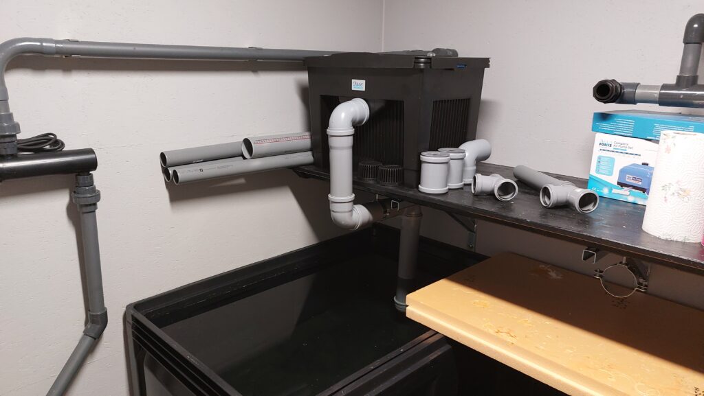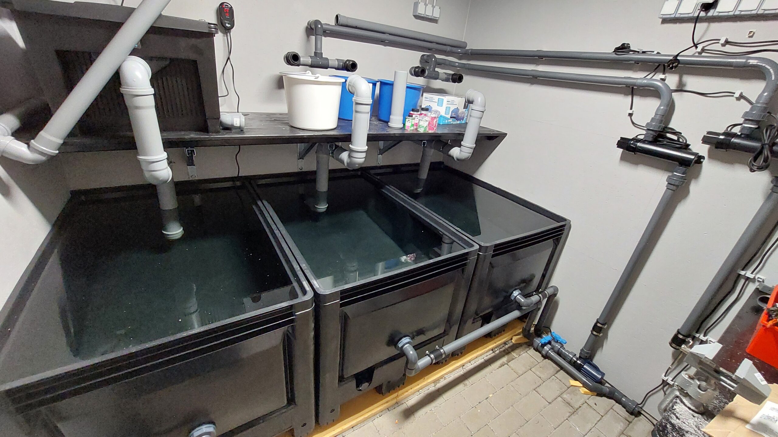 Im ersten Schritt platziere ich alle Komponenten, die ich miteinander verbinden möchte und montiere die UV-C-Lampen an den Wänden. An der linken Wand verbinde ich das erste Becken mithilfe der UV-C-Lampe mit dem Filter und an der rechten Wand platziere ich die beiden anderen UV-C-Lampen für Becken 2 und Becken 3. Die Filter beider Becken werde ich ebenfalls entlang der rechten Wand verrohren.