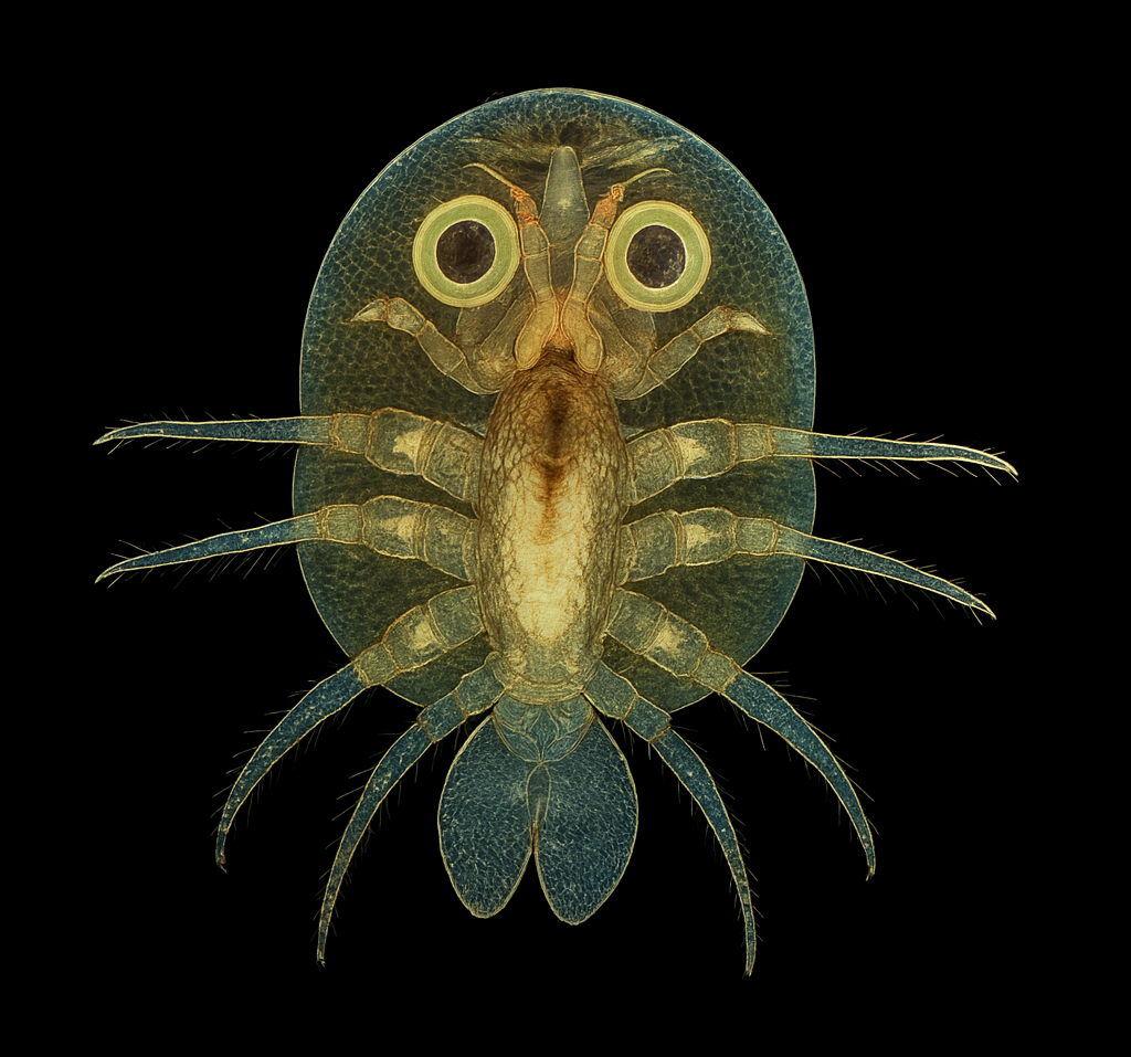 Argulus gehört zu den Branchiura, kleinen parasitären Krebstieren mit einem flachen, schildartigen Körper und zwei Komplexaugen. Sie saugen Blut und Gewebsflüssigkeit, können den Wirt verlassen und legen Eier an festen Oberflächen ab. Das macht sie anders als typische Protozoen‑ oder Wurmparasiten.