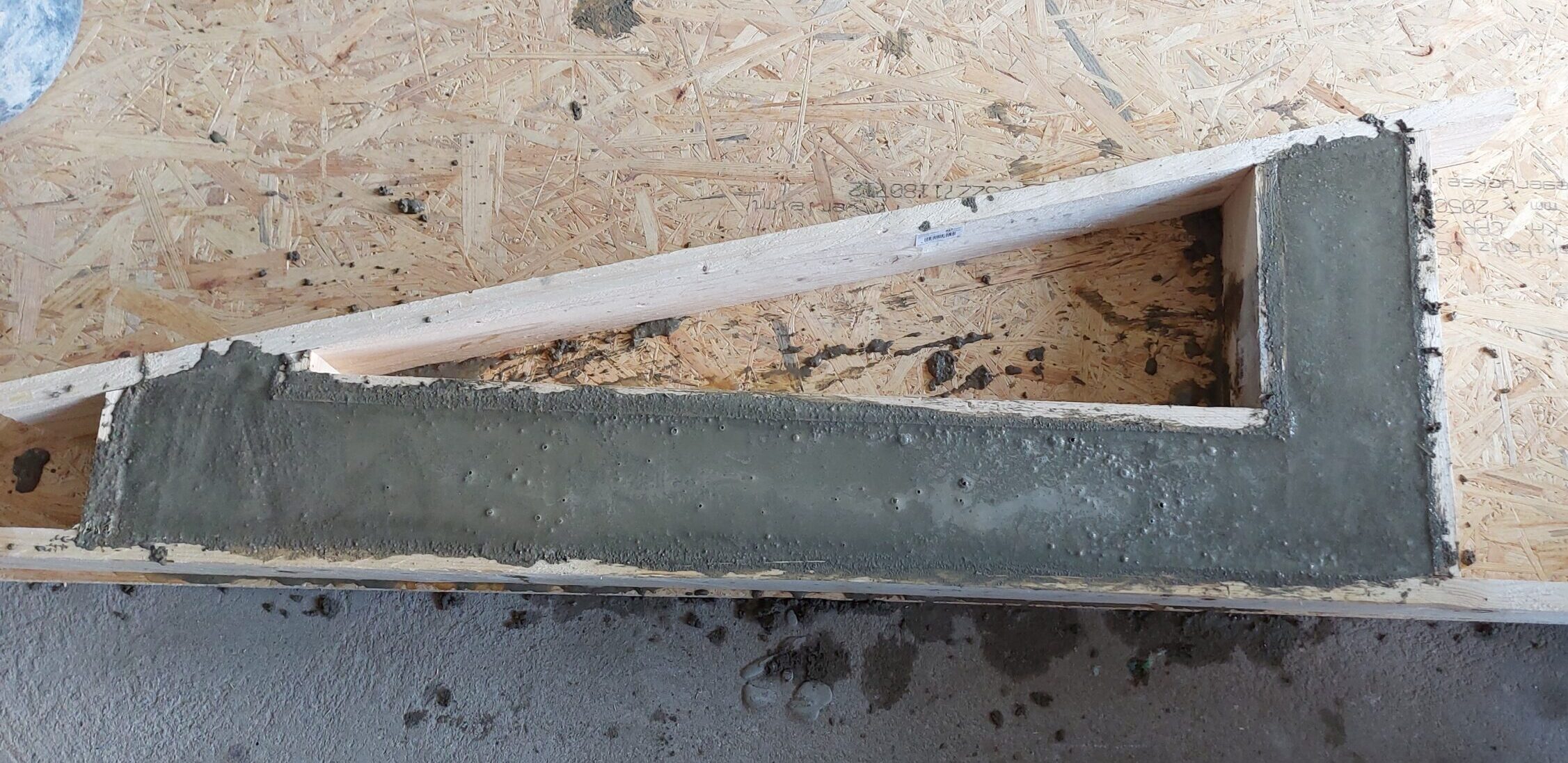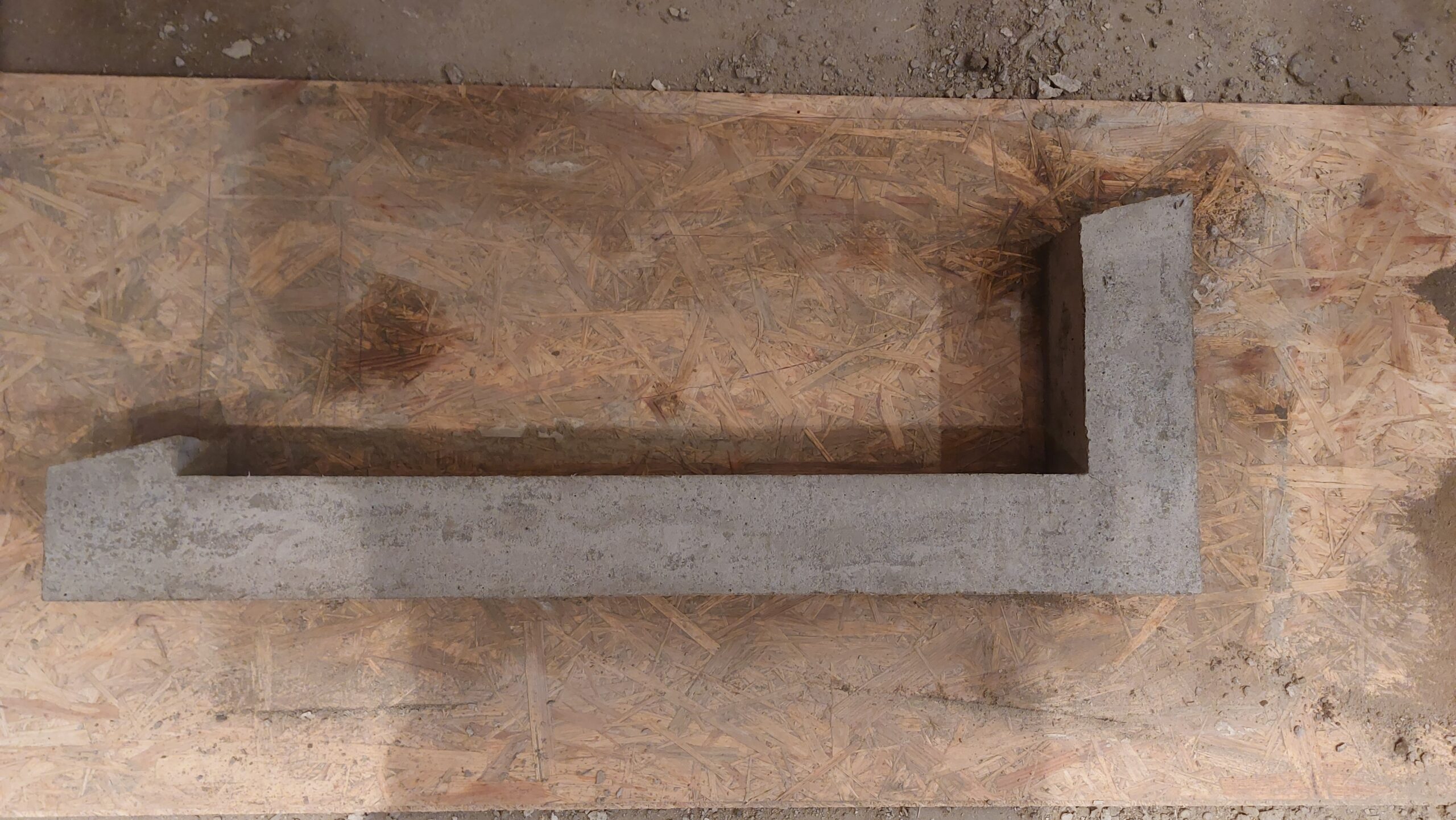 Dazu fertigte ich eine Schalung aus Schalholz auf einer OSB‑Platte an. Auch wenn OSB nicht das ideale Material ist, da es nicht wasserresistent ist, habe ich es trotzdem verwendet – es lag noch bei mir herum. Während des Betonierens legte ich zusätzlich ein Armierungseisen mit 8 mm Stärke mittig in das Bauteil ein, um die Stabilität zu erhöhen.