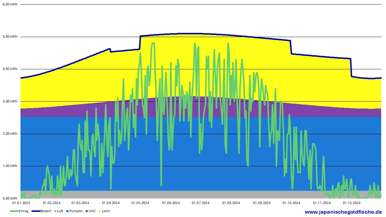 Kurz vorab zum Diagramm: Hier ist der Energiebedarf im Laufe eines Tages dargestellt. Ganz unten sieht man die Luftpumpe in Grau, darüber die drei Wasserpumpen in Blau. In Violett folgen die drei UVC‑Lampen und in Gelb die sechs Leuchten. Dem gegenüber stehen drei Ertragskurven der PV‑Anlage – vom 13. Mai, 15. Oktober und 24. Dezember. In der dunklen Jahreszeit steht die Sonne deutlich tiefer. Dadurch wirft das Dach des Nachbarhauses am Abend einen Schatten auf die PV‑Module – und genau das führt zu dem abrupten Einbruch der Ertragskurve.